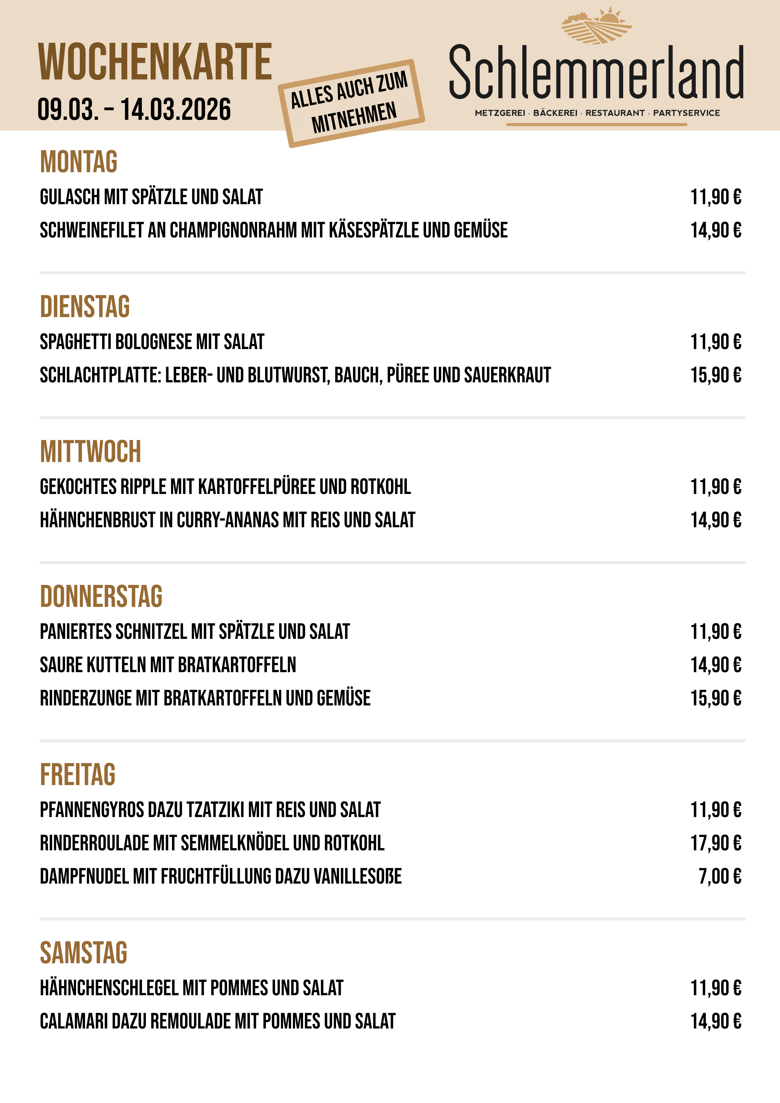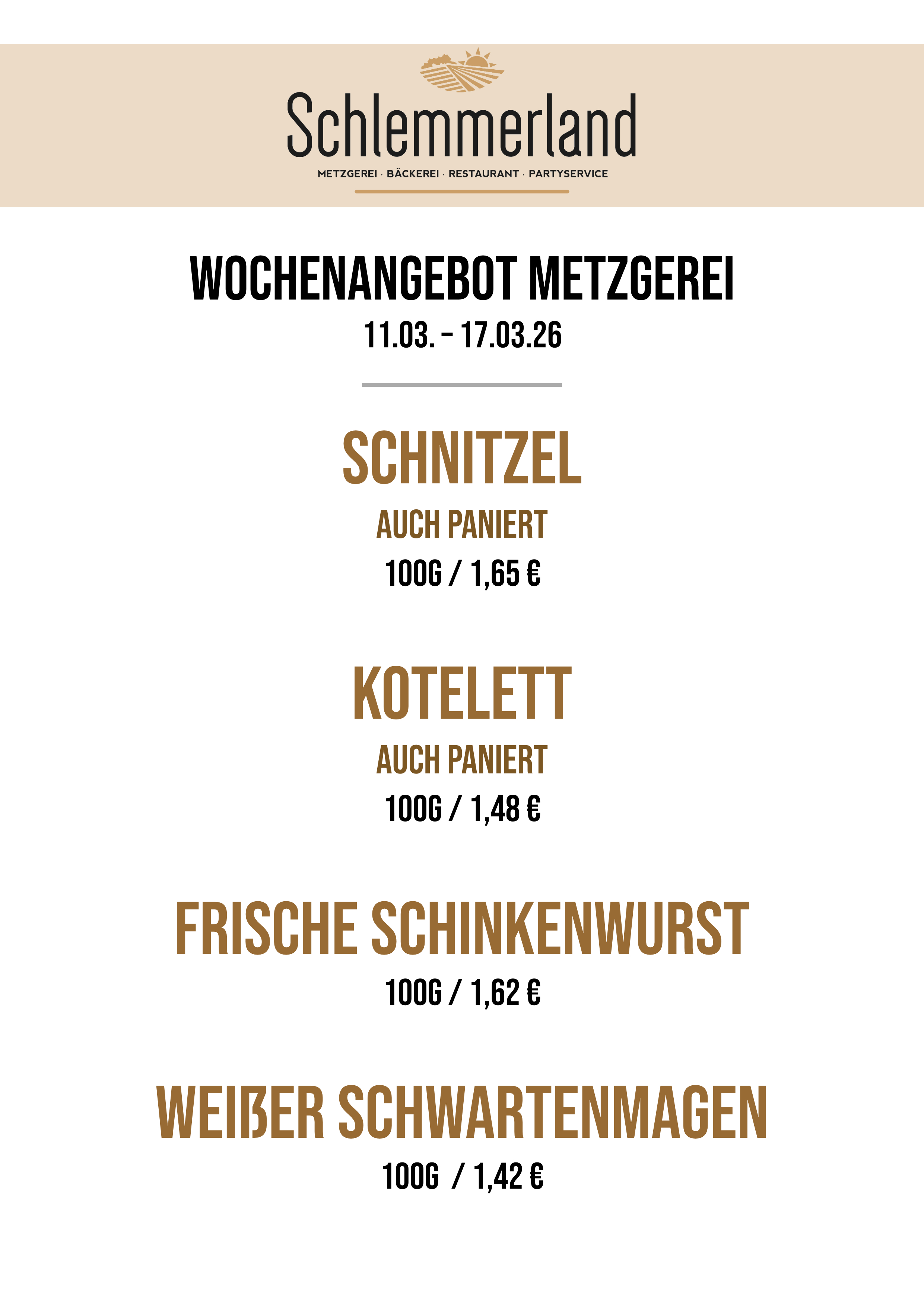 Hier finden Sie unsere Wochenkarte sowie die Metzgerei-Angebote: